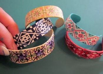 Очень просто сделать браслеты из деревянных палочек для мороженого или медицинских шпателей. Для этого надо предварительно в течение суток замочить их в воде, чтобы они стали гибкими. Медицинские шпатели можно купить в аптеке, и они будут лучшей основой если ты хочешь браслет потолще. Теперь надо достать их из воды и очень аккуратно поместить в стакан или чашку подходящего диаметра так, чтобы палочки приняли их форму. Оставьте их в таком положении сохнуть. Предже чем доставать палочки из чашек, убедитесь, что они полностью высохли. Вот такие заготовки для браслетов у вас должны получиться. Осталось раскрасить браслеты своими руками красками, украсить тканью, бумажной аппликацией в технике декупаж, бусинками, пуговицами или чем-то другим. Полезный совет: лучше сделать браслет чуть меньшего диаметра, чем вам требуется, т.к. при украшении браслета, в частности, при обработке его краской и клеем, он может немного распрямиться и стать больше. ![]()