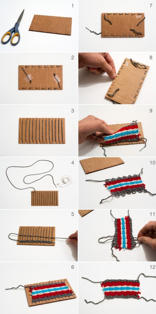 Как связать красивый коврик для куклы без спиц? На самом деле сделать это довольно просто, его нужно сплести. Тебе понадобятся нитки для вязания того цвета, какого ты хочешь чтобы был твой коврик. Картон размером примерно 7 на 12 сантиметров, но подойдет и другой. Также тебе понадобятся ножницы. А вязать мы будем вот такие красивые коврики: Кстати, точно также можно вязать платья для кукол. Только нужно будет подобрать размер картона и сшить две половинки платья вместе. Наглядная инструкция по вязанию без спиц: (комментарии и пояснения под картинкой) Самое главное это правильно сделать заготовку для вязания. Для этого нужно взять картон и на равном удалении друг от друга (можно сделать разметку с помощью линейки) сделать 12 - 13 надрезов (по 0,5 см). Надрезы должны быть сделаны с каждой из самых длинных сторон друг на против друга. Теперь нужно взять длинную нить для вязания и один ее конец приклеить к картонке кусочком скотча. Это будет обратная сторона (не рабочая) (пример №2). Нитку нужно продеть в крайний первый паз и провести через противоположный пас на рабочей стороне, перевернуть картонку, сделать стежок (уже горизонтальный) через соседний паз, снова перевернуть картон и провести нитку на противоположную сторону. И так до конца картона, затем нужно оставить конец нити небольшой длинны и также приклеить его скотчем к обратной стороне. Обратная сторона твоего картона должна выглядеть как на примере №2, а рабочая как на примере №3. Теперь начинаем плести коврик. Возьми нить для вязания (довольно большой длинны), завязи небольшой узелок на верхнем краю первой ниточки нашей заготовки и проводи нить через натянутые полоски. Только обязательно нужно то заводить нить под нить основания, то проводить под ней - чередуй. Когда нитка закончится ее нужно будет привязать узелком к основанию. Если захочешь добавить нитку другого цвета, точно также сначала привяжи ее к основе, а затем продолжай плести. Когда коврик будет готов, убери скотч с обратной стороны, аккуратно вынь ниточки из пазов и сними коврик с картонки. Затяни, растянувшиеся ниточки и не забудь закрепить концы. Все ты сплела настоящий узорчатый коврик, часть платья или юбки для куклы. Если взять картон меньшего размера (более узкий), то можно сплести кукле шарф. Так что теперь ты можешь сплести много полезных предметов для своих кукол.