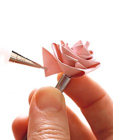 Маленькая розочка из бумаги. Для поделки тебе понадобится специальный инструмент для работы в технике квиллинг, или старый стержень от ручки (который уже не пачкает). Также тебе понадобится кусок бумаги размером 1,5 сантиметра на 30 сантиметров. Намотай бумагу на основу, сделай три оборота для сердцевины. Отогни бумагу от себя под прямым углом. Начни заматывать бумагу снова, чтобы сформировался загнутый уголок. Основание промажь клеем, чтобы закрепить форму цветка. Через некоторое количество лепестков повтори этап номер два. Когда розочка будет нужного тебе размера приклей конец бумаги к цветку (если хвостик будет сильно длинным обрежь лишнее). ![]()