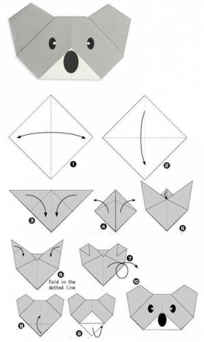 Возьми квадратный листок серой цветной бумаги и сложи оригами, следуя схеме. В конце нарисуй черным фломастером глаза и нос.