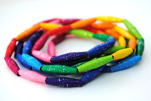 Тебе понадобятся: Листы цветной бумаги. Желательно чтобы цвета были яркими и насыщенными. Ножницы. Кисточка или тонкая круглая палочка для накручивания листочков. Клей. Прозрачный лак для ногтей с блестками, если ты захочешь добавить немного блесток на готовое изделие. Первым делом нужно вырезать из листов цветной бумаги вот такие длинные треугольнички, как на фотографии: Длинной примерно 15 сантиметров и максимальной ширины 2-3 сантиметра. Возьми треугольник бумаги, кисточку или палочку на которую ты будешь накручивать бумагу (начинай закручивать с широкого конца) и аккуратно намотай бумагу на палочку. Конец бумаги аккуратно приклей клеем к основной части. Теперь сними закрученную бумажку с кисточки или палочки. Если сделать много таких бумажек и украсить их блестками, то получится интересное украшения для наполнение вазочек. А если продеть нитку и на низать готовые закрученные бумажки, а потом аккуратно завязать ее, то получатся оригинальные бусы. А еще ты можешь одеть такую бумажку на булавку и она сразу превратиться в интересное украшение.