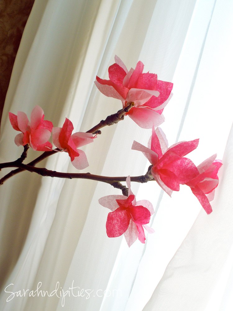 Мы уже публиковали одну версию урока по созданию цветущей сакуры. Этот урок похож на предыдущий, но все-таки немного отличается. Для поделки тебе понадобятся: веточки без листьев, гофрированная цветная бумага двух оттенков розового цвета, ножницы и клей. Вырежи квадратики (6-7 см) гофрированной бумаги и сложи их в четыре раза. Вырежи цветочки с пятью лепестками, как показано на примере. Соедини вместе цветок более темного оттенка с цветком светлого оттенка. Капни капельку клея в центр лепестка и аккуратно скрути оба лепестка в середине. Аккуратно приклей каждый цветочек к веточке. Твоя веточка цветущей сакуры готова.